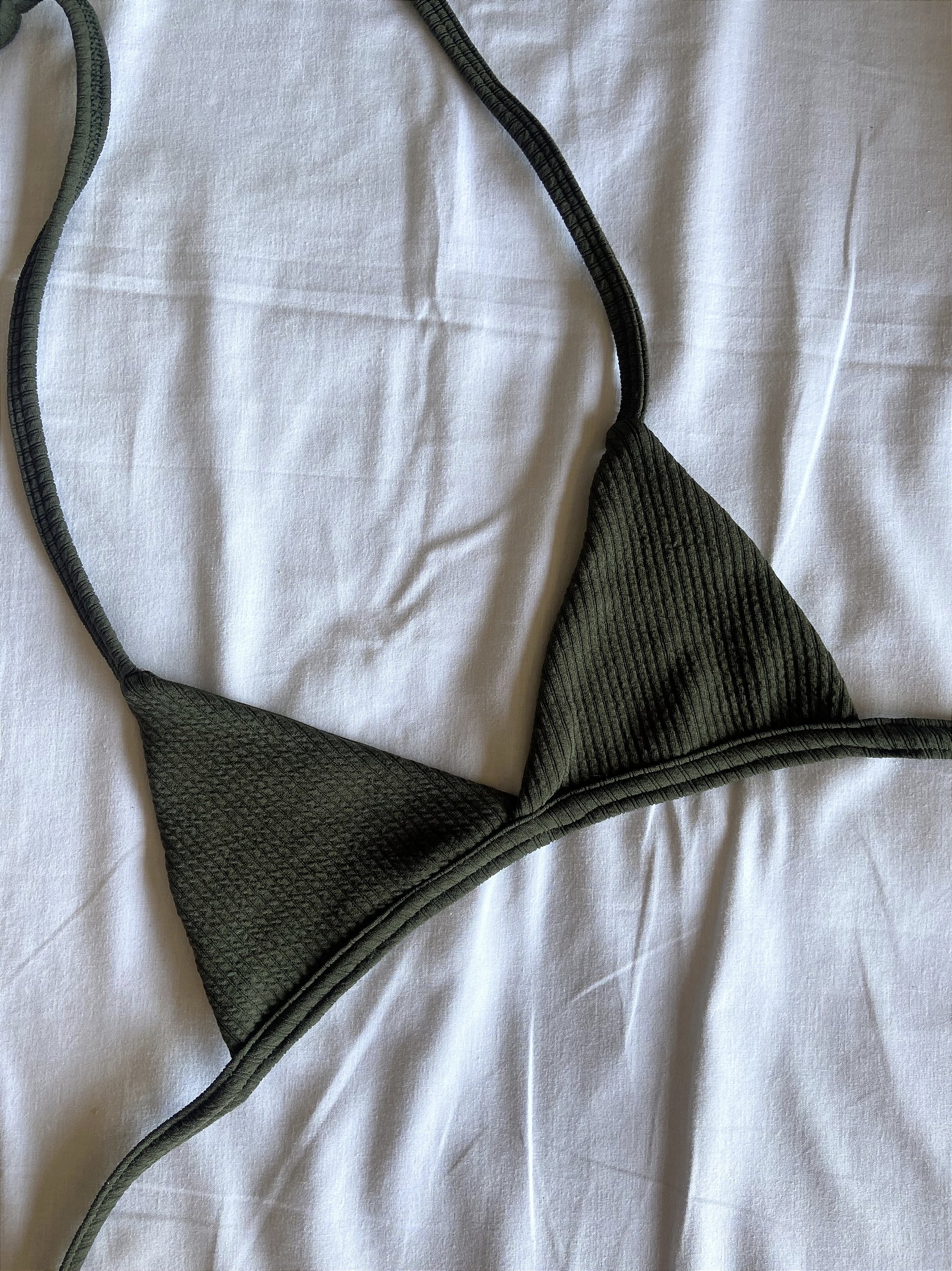 Top fixo feito em tecido texturizado com forro no busto. Possui uma passagem na alça do pescoço para que a marquinha fique igual de sutiã (pode ser usada de duas formas) <3