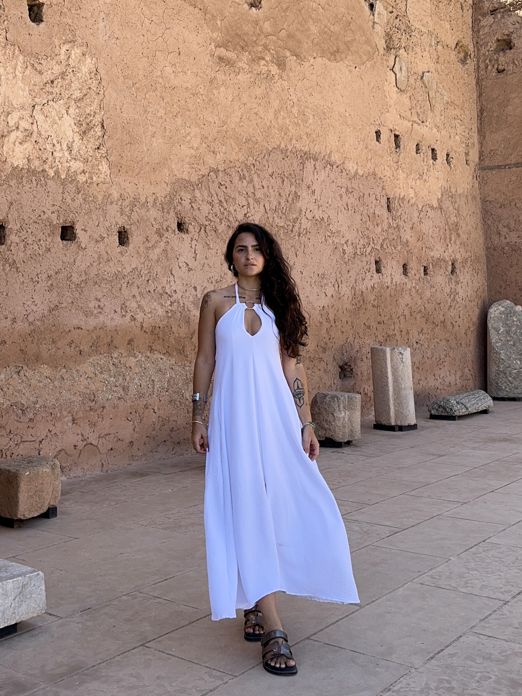 Vestido longo com modelagem solta, decote com detalhe em argola e amarração no pescoço. A cor branca possui forro para não ter transparência.